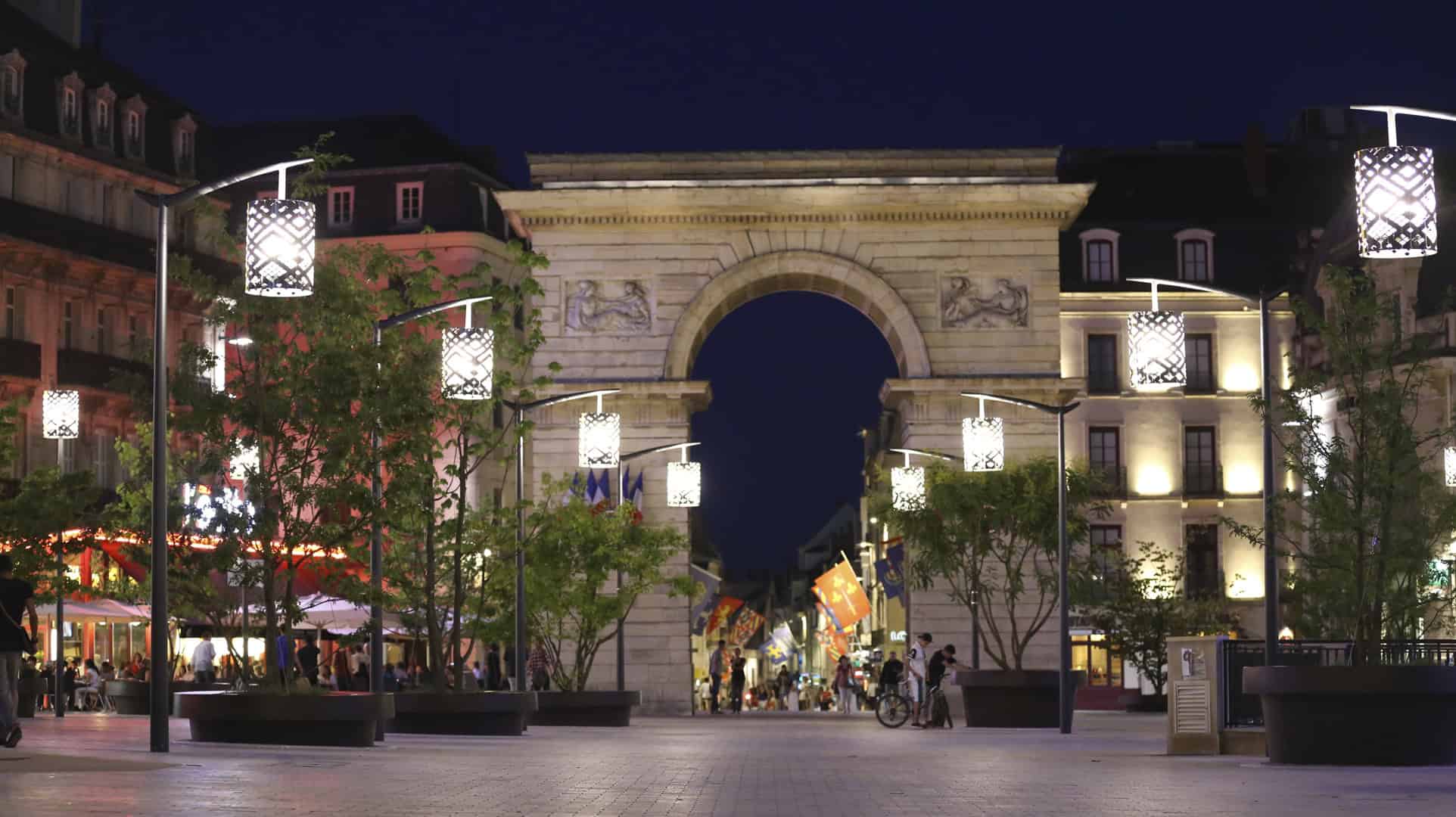**Place Darcy** — Dijon, France. A historic city square reimagined through contemporary lighting design, with bespoke luminaires that contribute to the daytime streetscape as well as the nocturnal atmosphere.