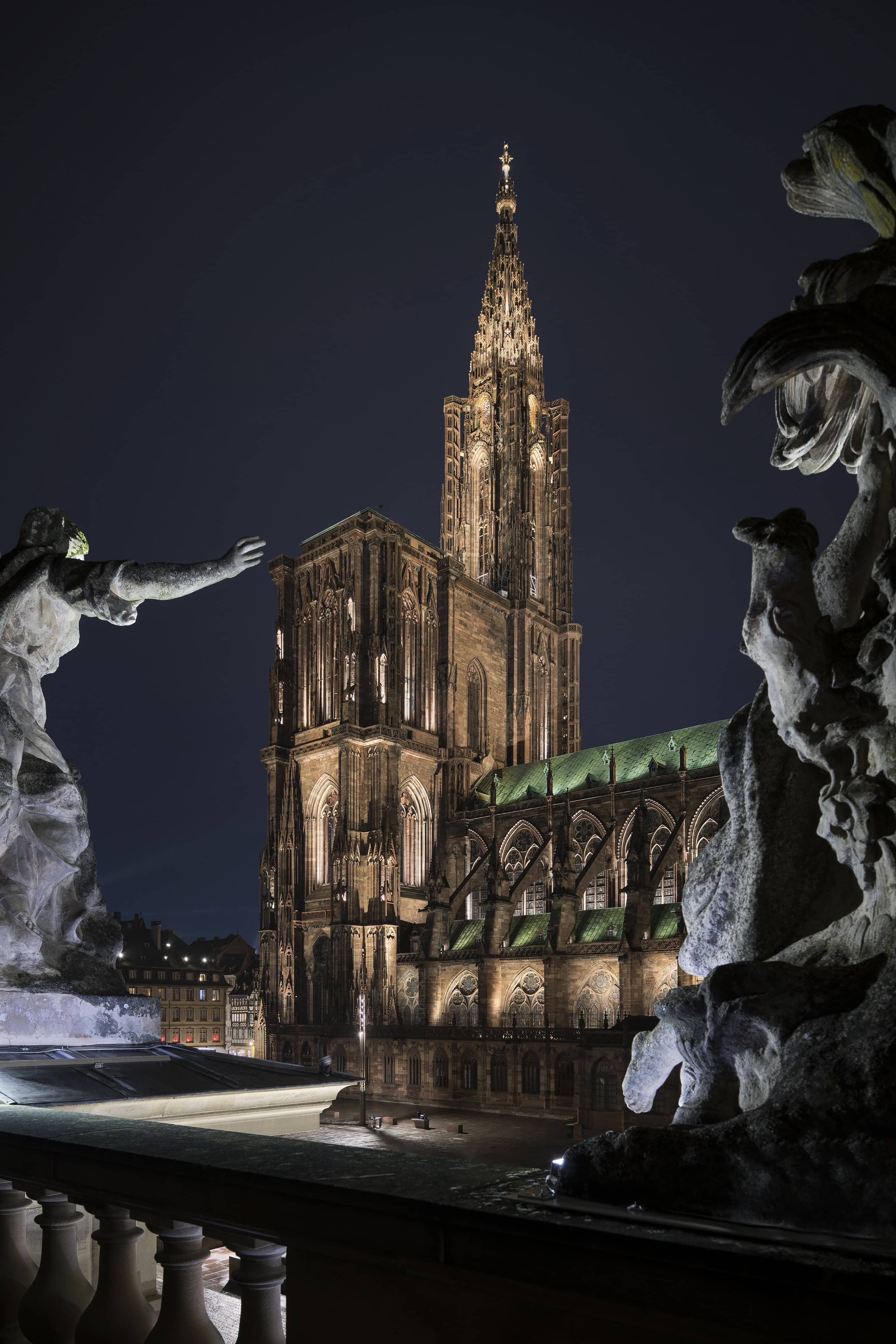 **Strasbourg Cathedral** — Strasbourg, France. Inaugurated 2016. Five international awards. A restrained and refined illumination of one of the masterpieces of Gothic architecture, designed to reveal the stone’s depth and the building’s monumental presence through shadow as much as light.